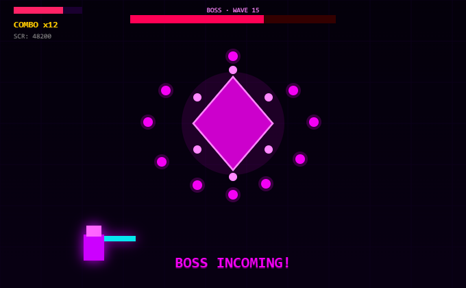 Boss every 5th wave. Each boss enters a deadly Phase 2 at 50% HP with faster bullet spirals and more aggressive movement.