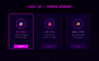 You are the last warrior standing in a neon-drenched world overrun by corrupted synthwave soldiers. Fight through endless waves of enemies, grow stronger with every kill, and survive long enough to face what lurks at Wave 5.